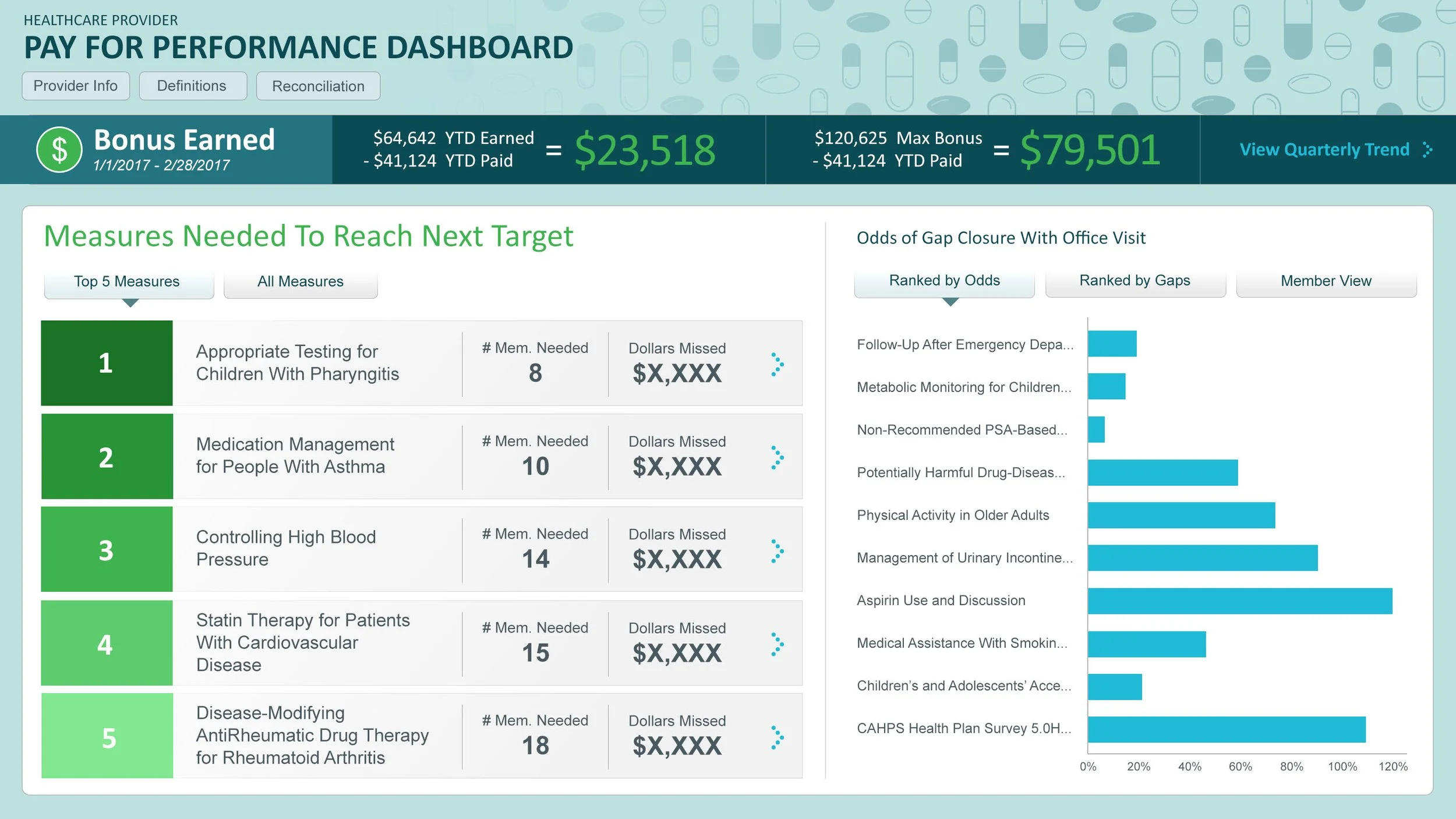 A MicroStrategy dashboard for a major healthcare company allowing providers to view their P4P metrics.