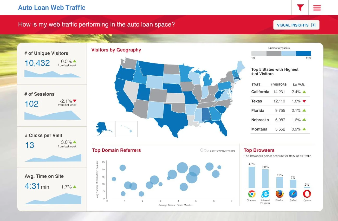 MicroStrategy dashboard for major bank to track web traffic for car loan products.