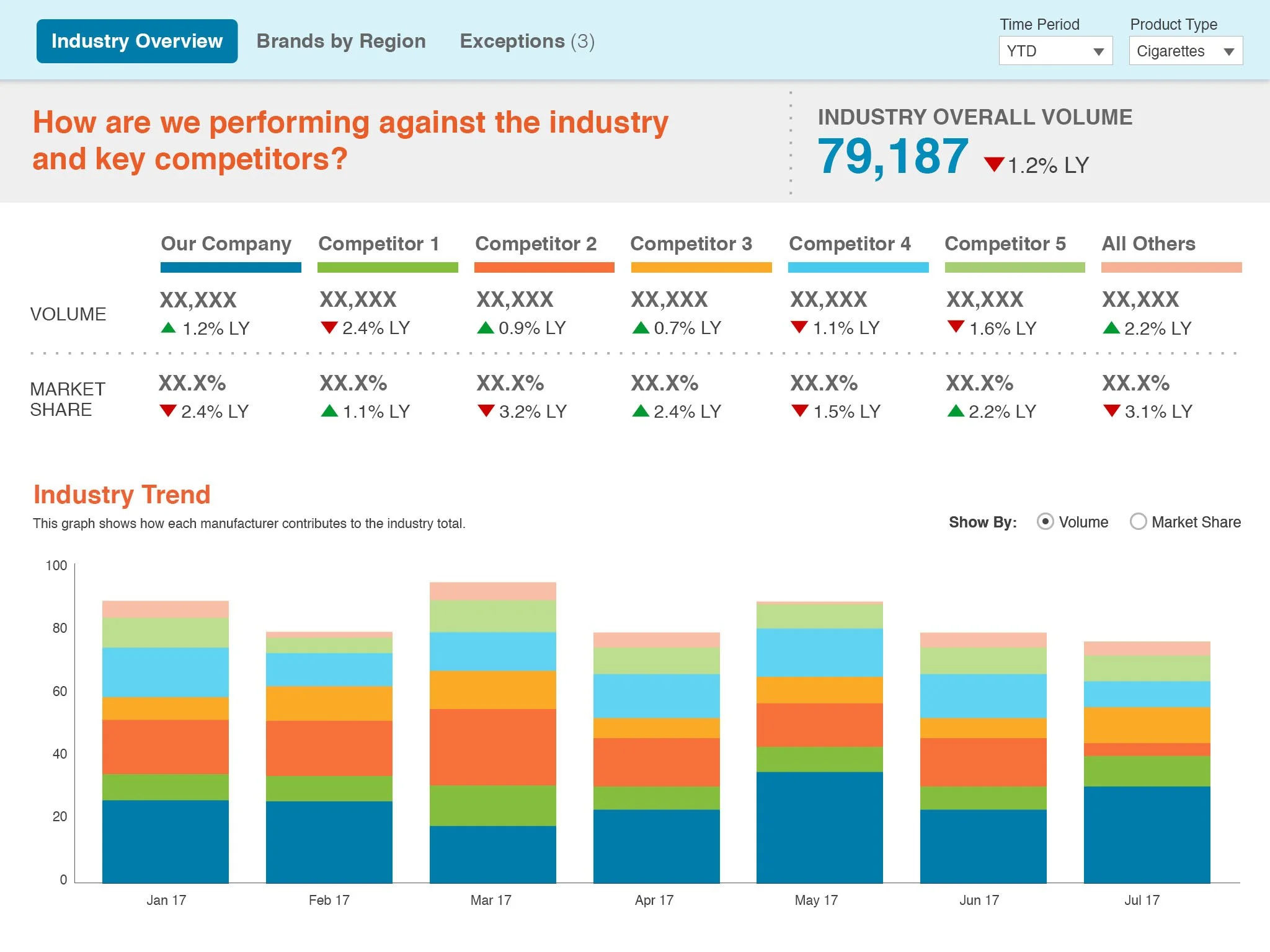 Tableau dashboard designed for a major tobacco manufacturer to track their market share and volume against competitors and the industry overall.