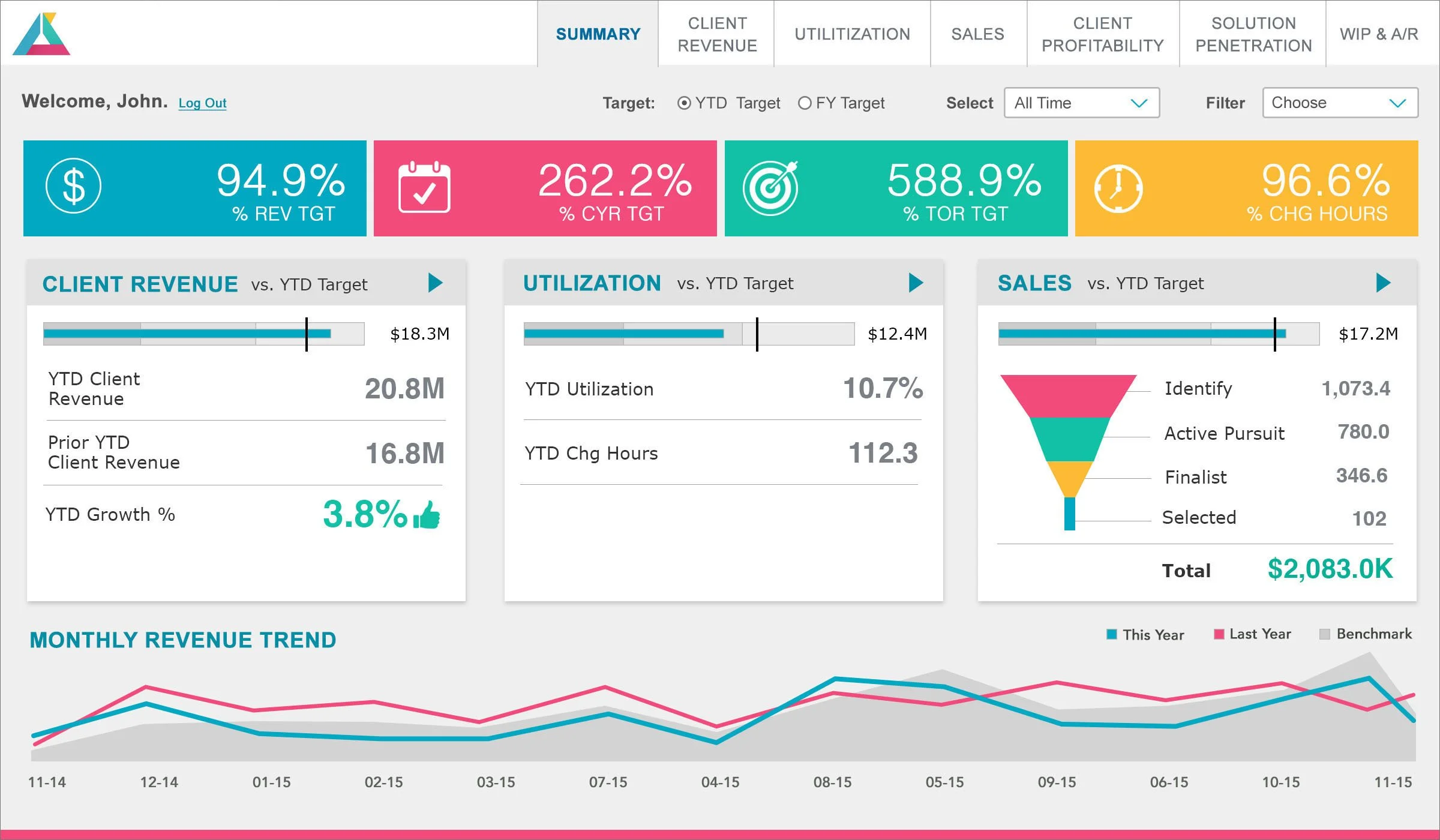A healthcare dashboard designed for Tableau that allows the client to view revenue, utilization, and sales metrics and trends over time.
