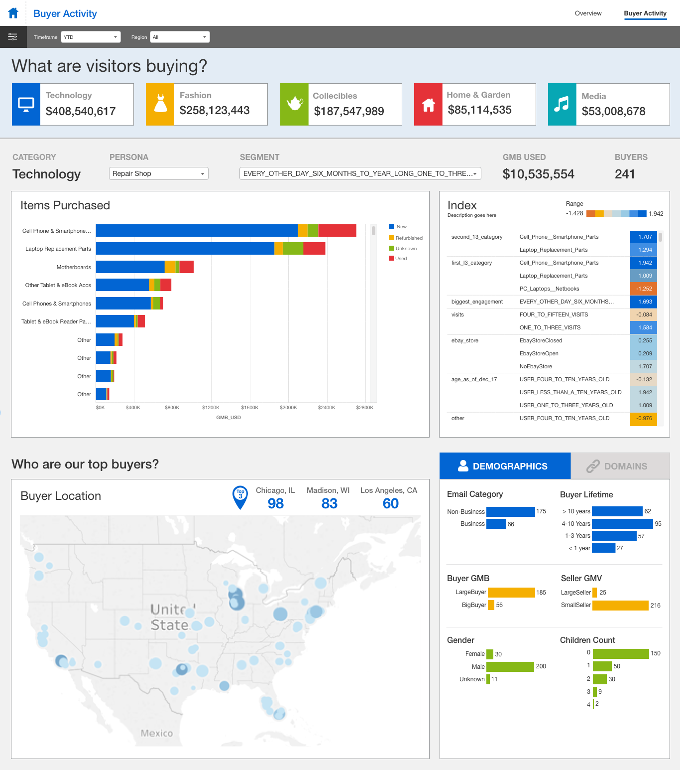 Tableau dashboard created for online marketplace to track buyer activity and demographics.